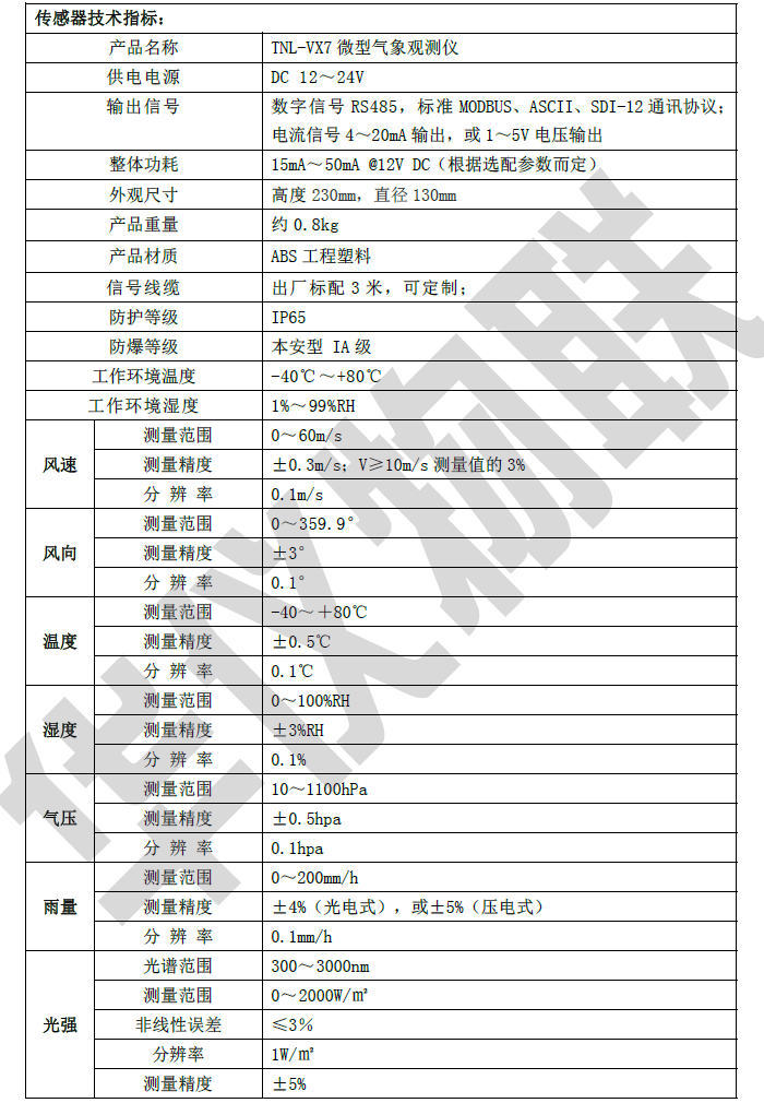 一、产品概述: TNL-VX7微型气象观测仪是一款集成了多项气象参数的小型观测仪器,结合了我公司多年的气象观测经验和一体化小型化的设计思路,将温湿风压雨/光强等多项常规气象参数高度集成为一体,产品功能全面,设计外形美观大方,用料考究得体,传感探头经久耐用,测量准确迅速,标准MODBUS协议输出RS485信号,采用超声波测风传感器,规避了传统探头的机械磨损老化现象;传感器顶端可选配降雨量和光照强度监测参数,高度融合,一体便携,是一款性价比极高的小型气象环境参数观测仪器。它适用于农林环境、交通环境,城镇街道,气象监测、桥梁隧道、航海船舶、航空机场等领域。  二、产品特点: 》采用超声波技术测量风速和风向 》采用压阻技术用来测量大气压力 》采用二极管结电压测量大气温度值 》采用电容式传感器测量大气相对湿度 》采用光电效应技术测量太阳光照强度 》采用光电式(压电式)原理测量降雨量 》根据使用环境可选配加热单元模块,能有效去除雨雪冰冻的影响,全天候全地域工作,无需定期维护。 三、产品技术参数: